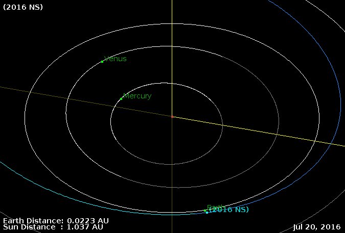 20. 7. 2016 v 19:41 SELČ v blízkosti Země prolétla planetka 2016 NS. Její odhadovaná velikost je mezi 15 a 47 metry, nalezena byla letos 4. července observatoří Mount Lemmon Survey. Zemi se nejvíce přiblížila na vzdálenost 0,02 AU, což je v přepočtu zhruba 8,70krát tak daleko od naší planety, než ji obíhá Měsíc.