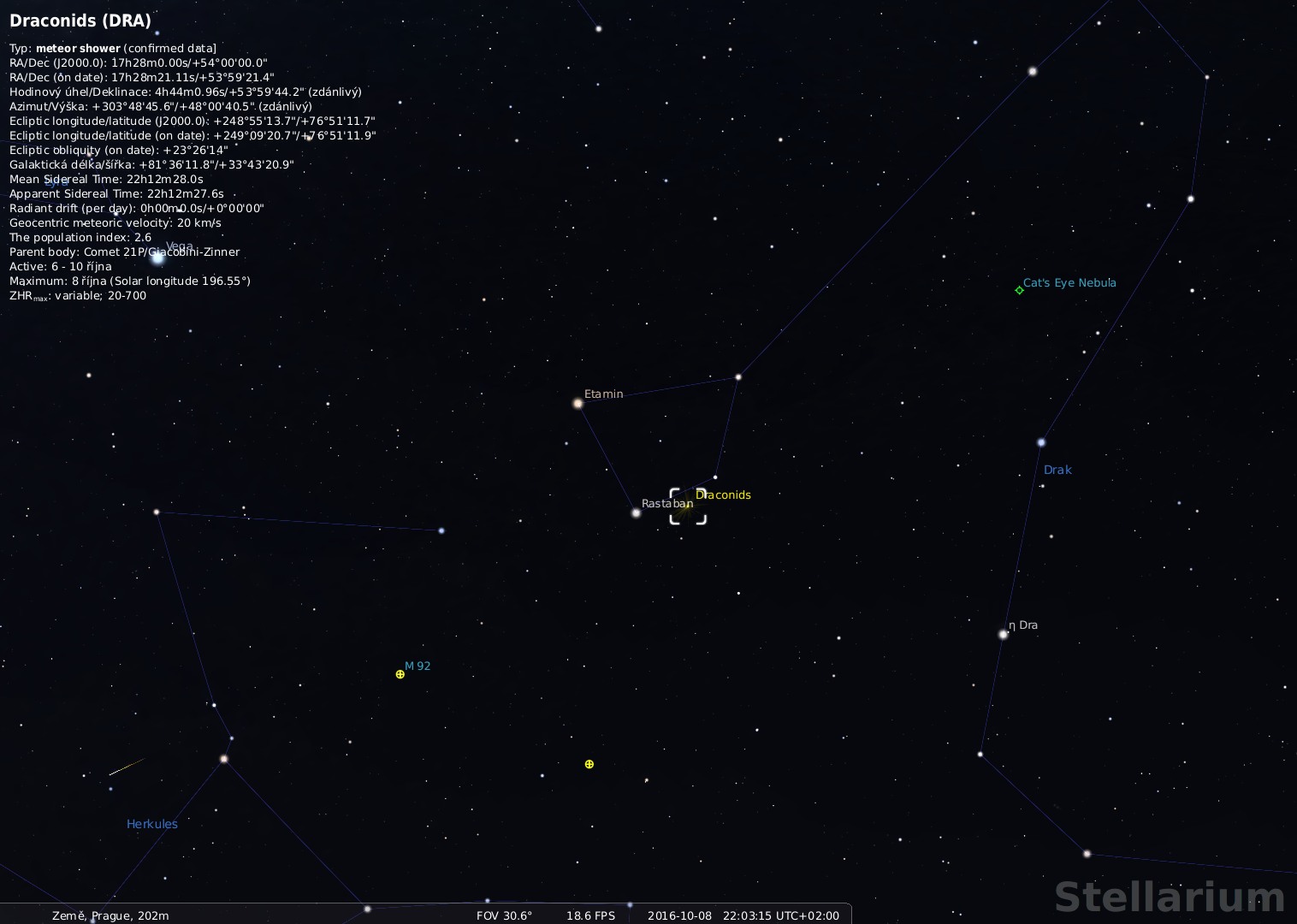 Poloha radiantu meteorického roje Drakonid (Stellarium)