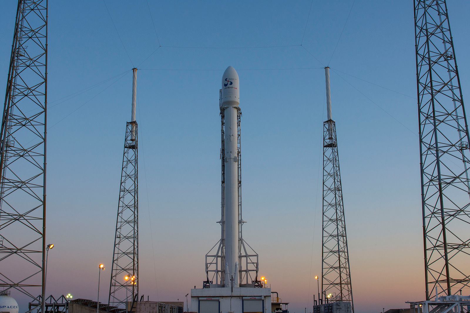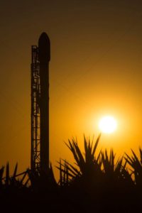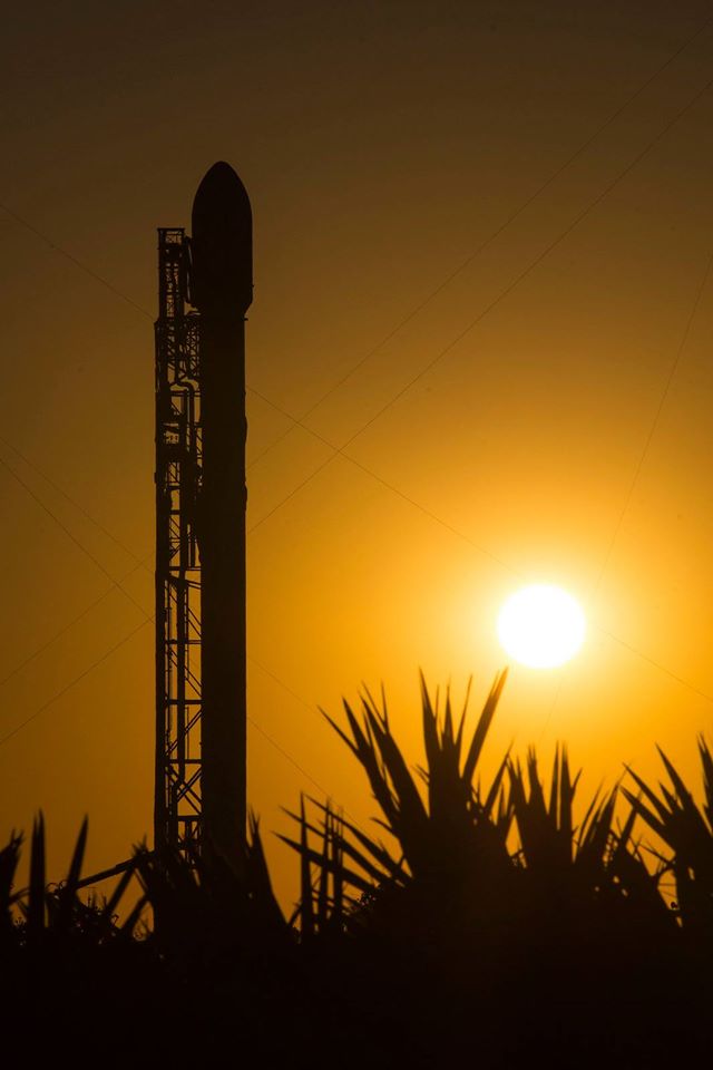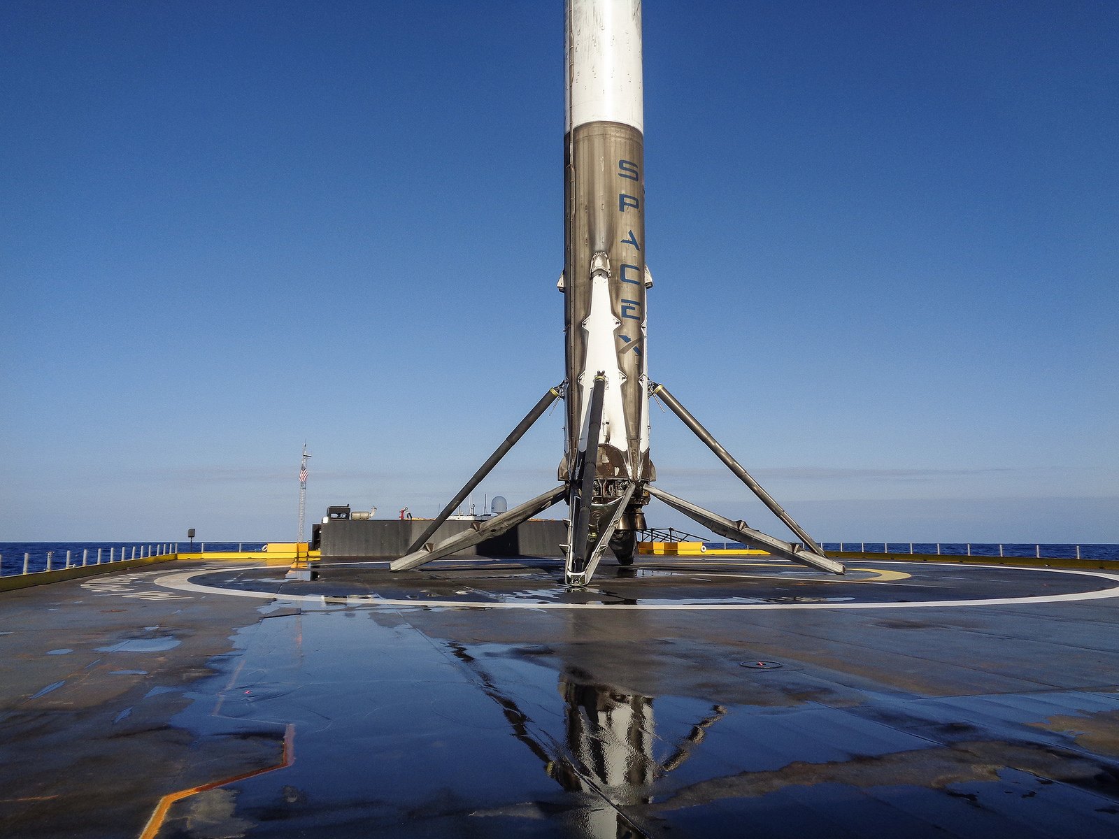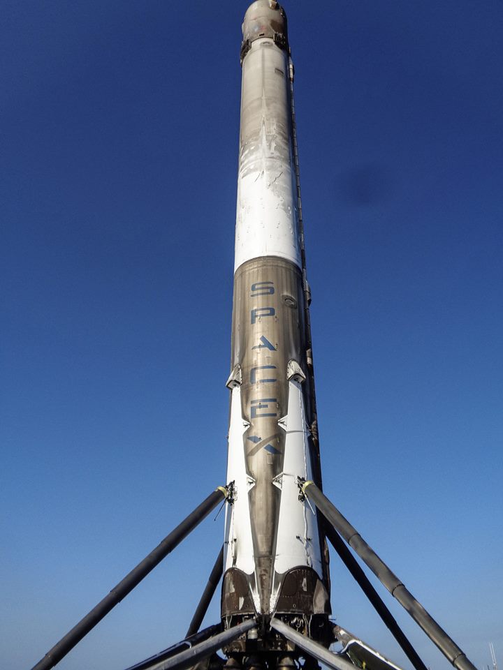 První stupeň rakety Falcon bezpečně stojí na plošině (kosmonautika.cz)