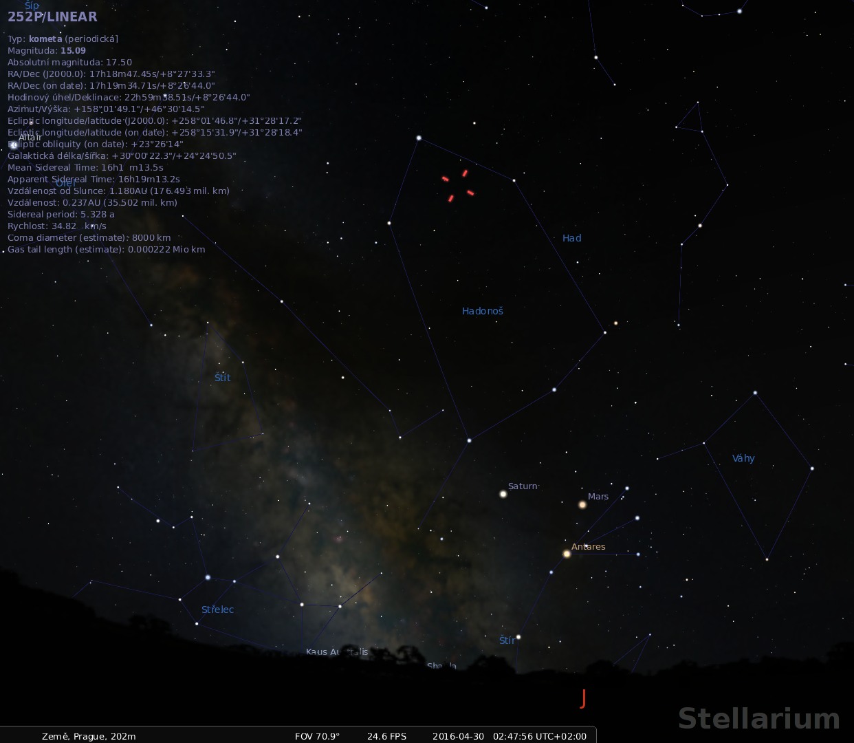 Poloha komety 252P na obloze (Stellarium)