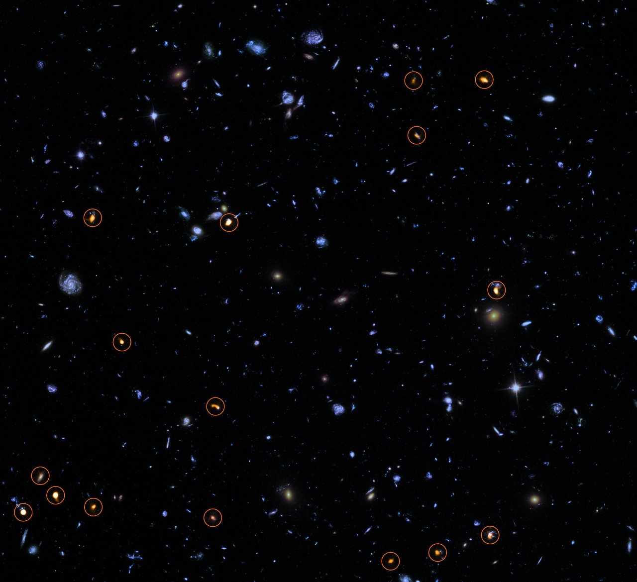 Oblast Hubble Ultra Deep Field promítnutá na pozadí záznamu pozorování observatoří ALMA (vyznačeno červenými kroužky) (eso.org)