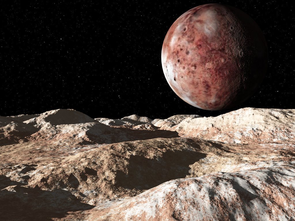 Uvidí niečo podobné sonda New Horizons? Umelecký pohľad na povrch Pluta a jeho najväčšieho mesiaca Chárona (facebook.com)