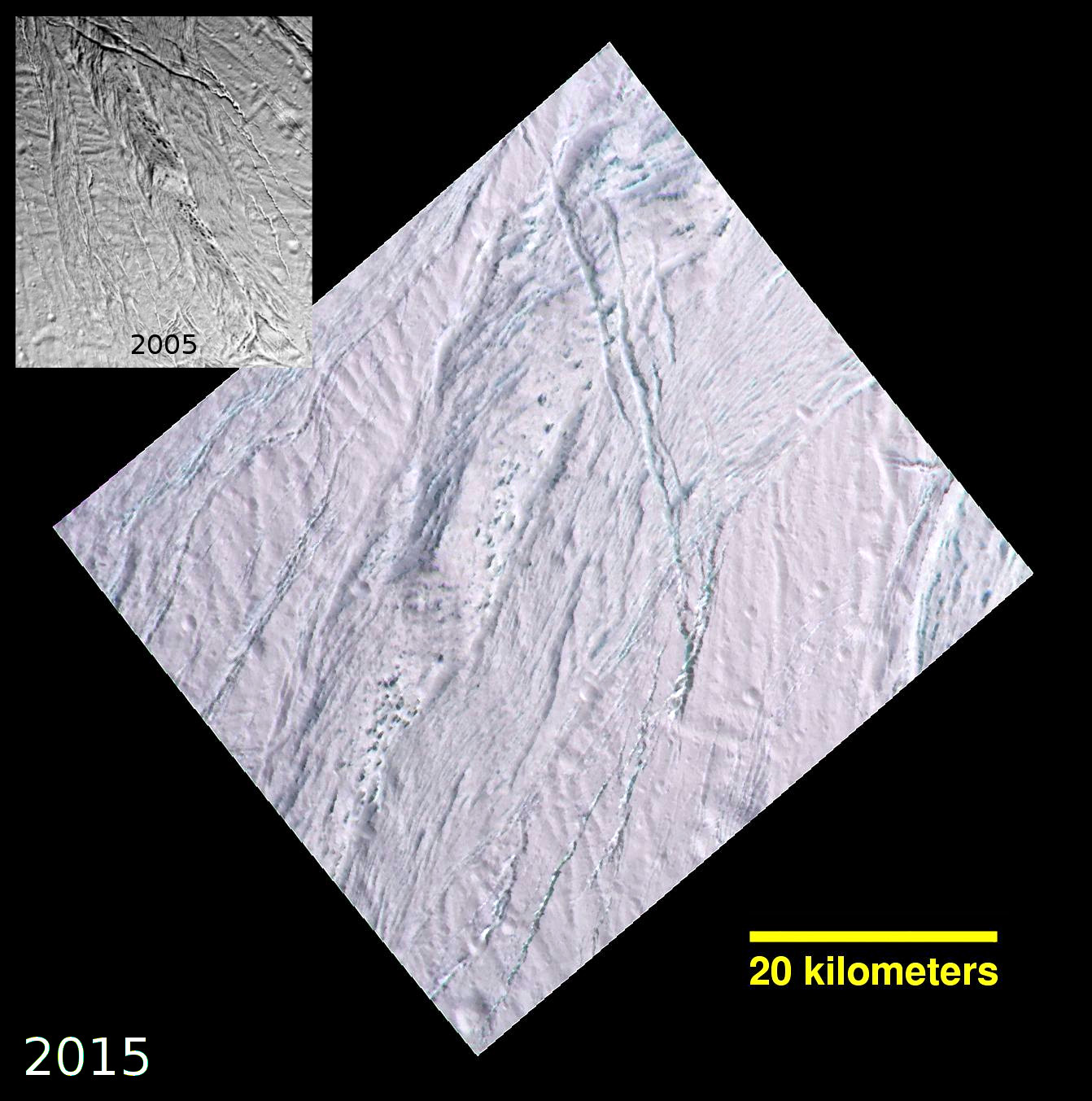 Sonda Cassini v prosinci 2015 naposledy během své mise u Saturna prolétla kolem měsíce Enceladus (ten se mimochodem pyšní výjimečnou odrazivostí povrchu). Na pořízených snímcích tak lze porovnat terén, který byl poprvé sondou zpozorován v únoru 2005.