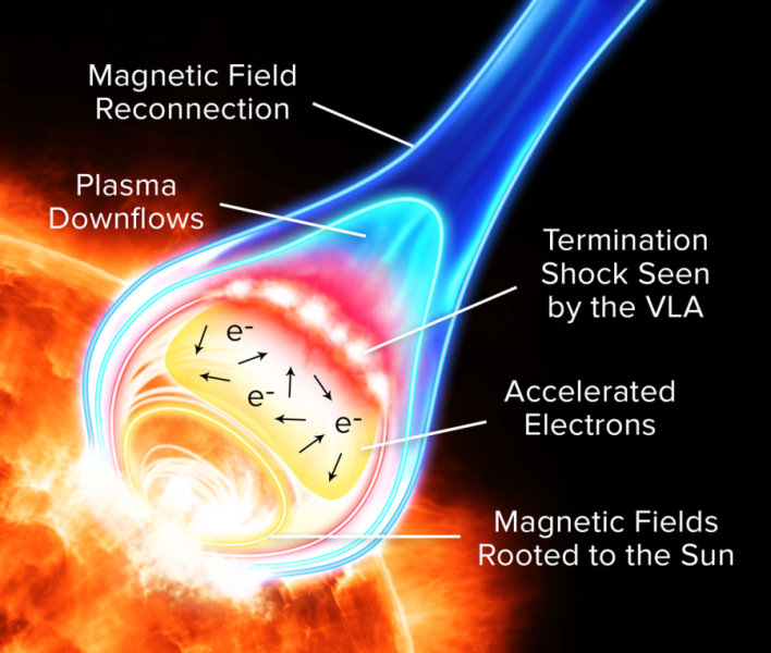 Vedci z Harvard-Smithosonian Center for Astrophysics s pomocou VLA radioteleskopu podporili domnienku o prekrytí magnetických polí. Zistili, že v hustých magnetických siločiarách vznikajú šoky, ktoré urýchľujú častice. Pozorovanie prostredníctvom VLA spolu s ultrafialovými a RTG sa uskutočnilo 3. marca 2012.