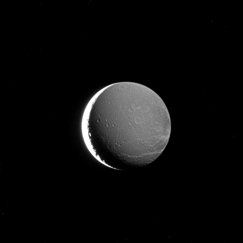 Dione je jeden z najväčších mesiacov Saturnu, na jeho povrchu sa nachádza, ako je to u nechránených mesiacov bežné, veľa kráterov. Ďalej tu nájdeme veľmi jasné útvary v podobe dlhých čiar. Tieto čiary sú veľmi plytké, pravdepodobne nezasahujú veľmi hlboko do povrchu. Na najnovšej fotke Cassini z 23. októbra, ktorá bola vydaná na stránkach NASA len nedávno je vidieť rôzne povrchové útvary, aj keď je väčšina osvetlenej časti skrytá. Toto je spôsobené fenoménom s ktorým sa často stretávame na Zemi, popolavým svitom. Keď dopadne svetlo zo Slnka na planétu, odrazí sa časť naspäť do okolia. Toto svetlo môže naraziť na neosvetlenú hemisféru okolitých objektov, pričom túto stranu mierne osvetľuje.
