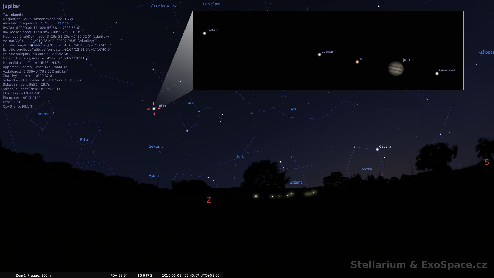 Jupiter spolu s měsíci počátkem června 2016 (Stellarium)